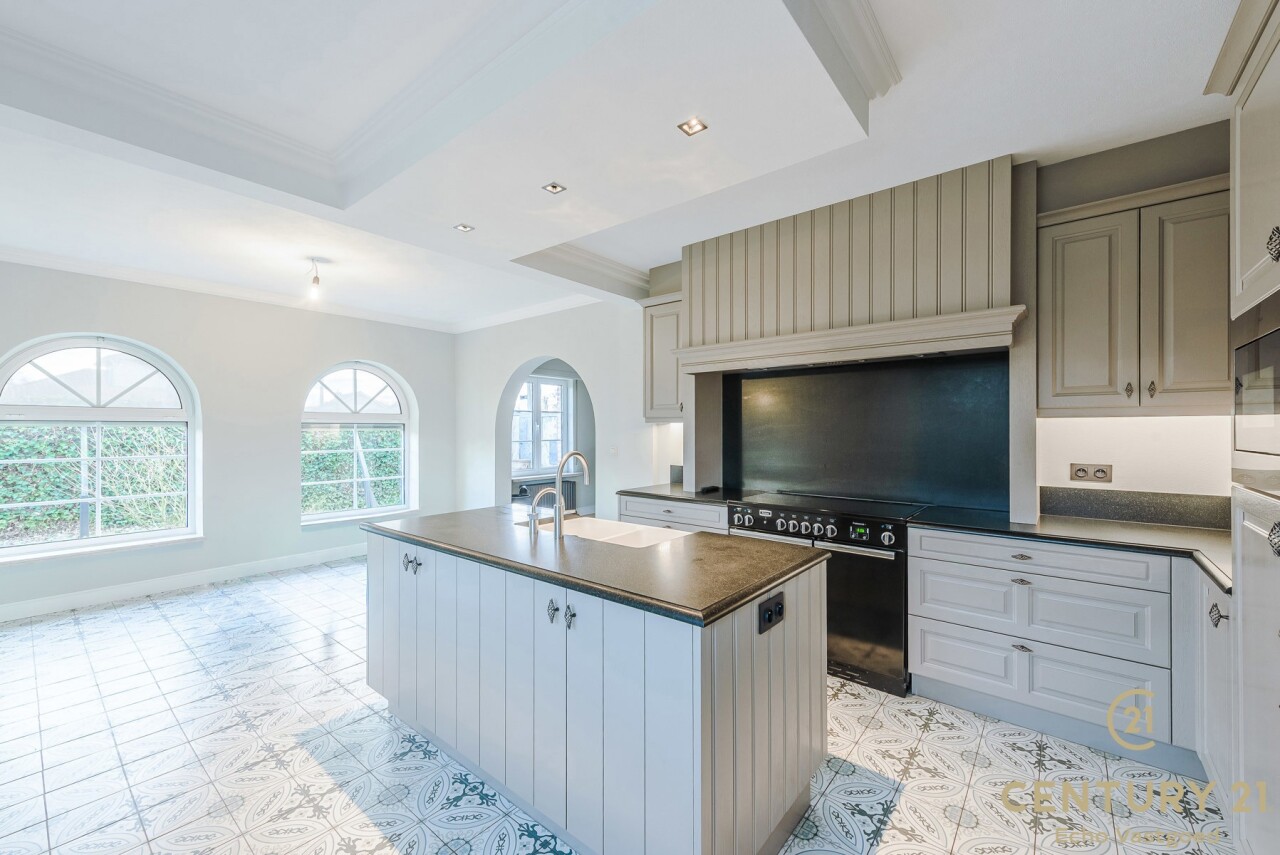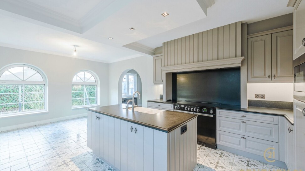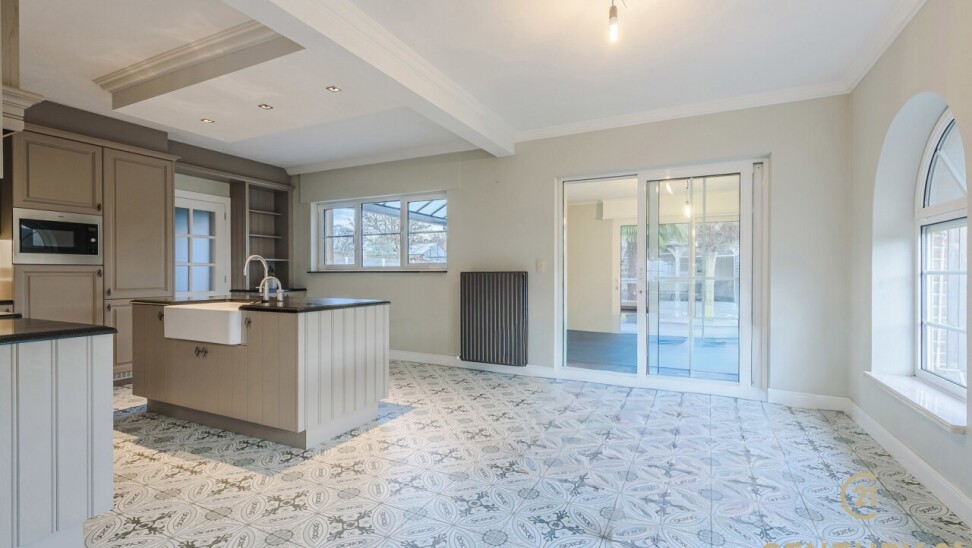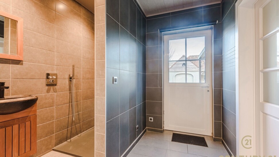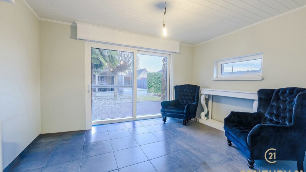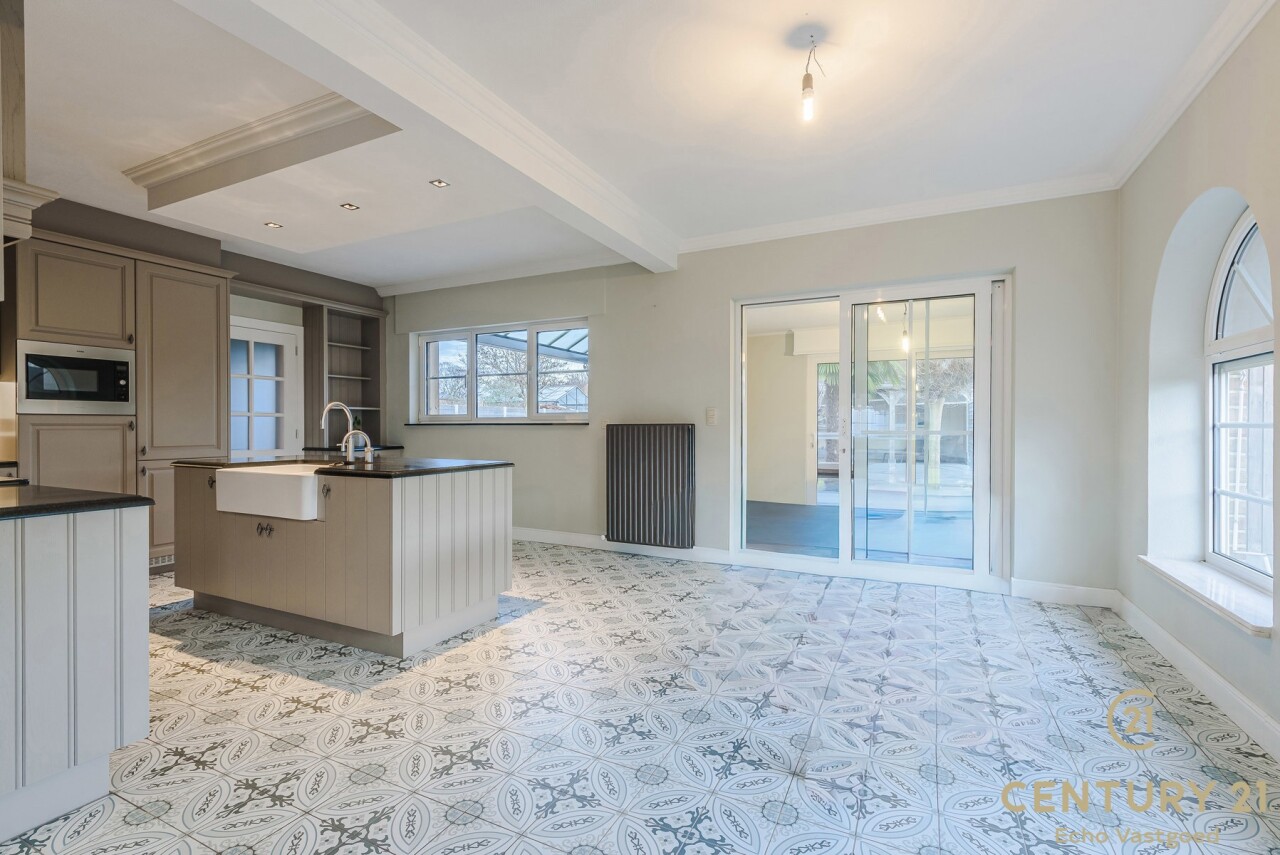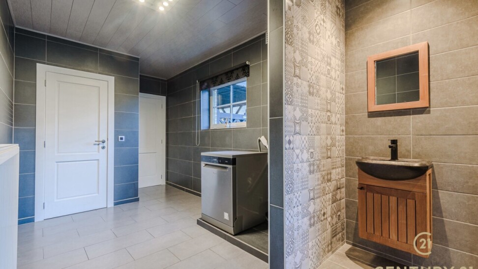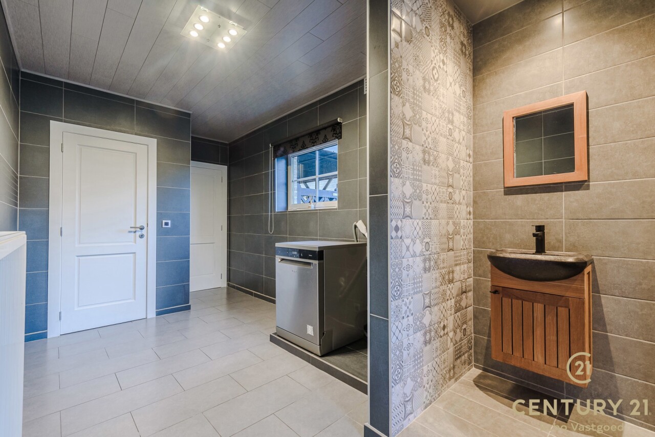 Adjacent to the living area is the large eat-in kitchen. This kitchen offers ample storage and is fully equipped with high-end appliances, including a large induction cooktop, professional oven, extractor hood, and refrigerator. From the kitchen, you can access the pleasant extension, designed as an additional sitting area with beautiful views of the garden, as well as the practical utility/laundry room, which also includes a modern walk-in shower.