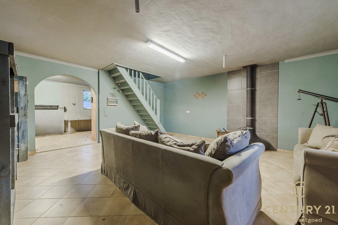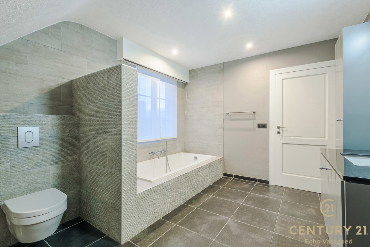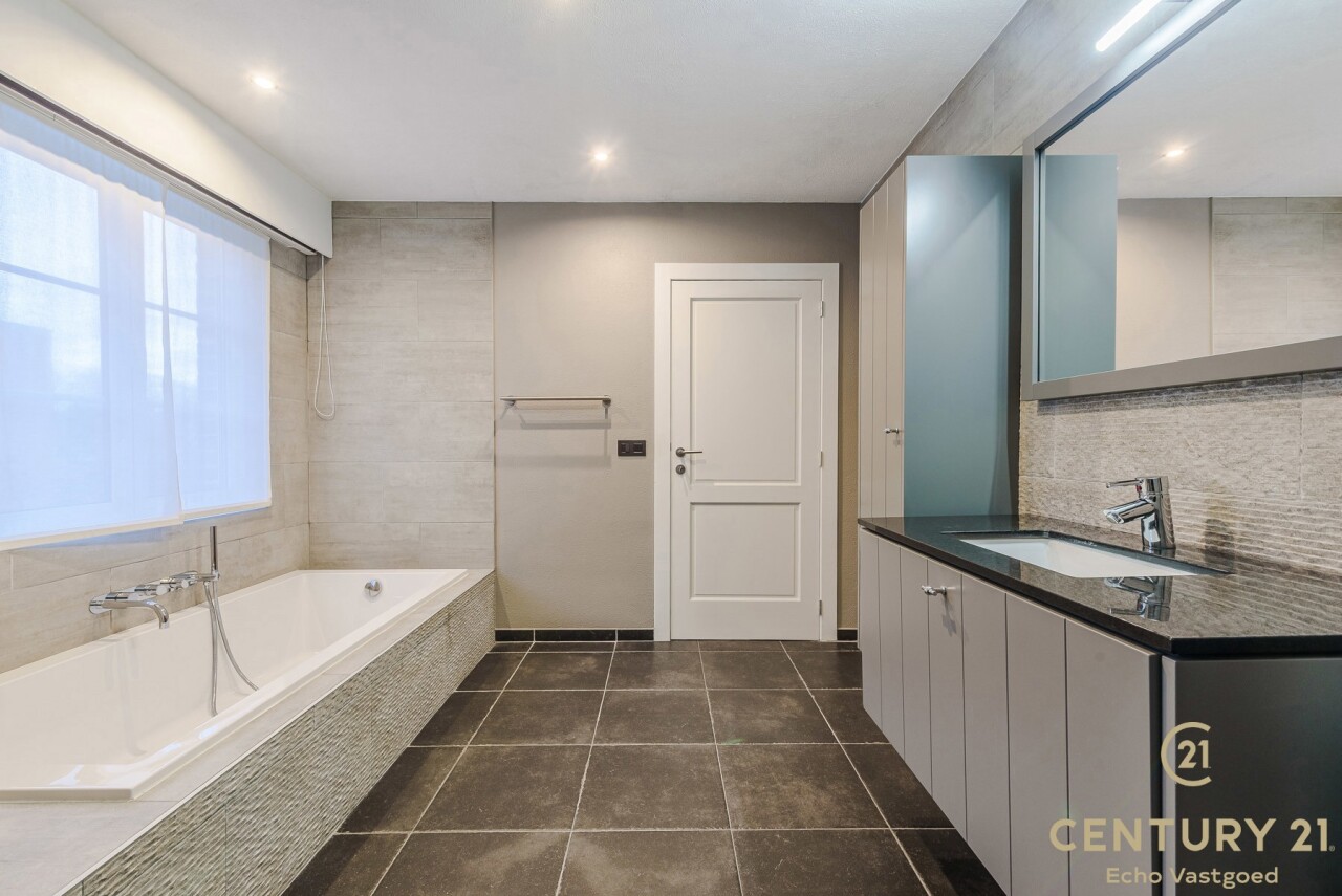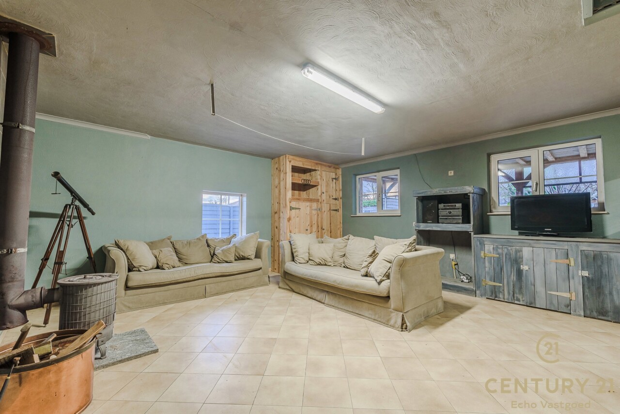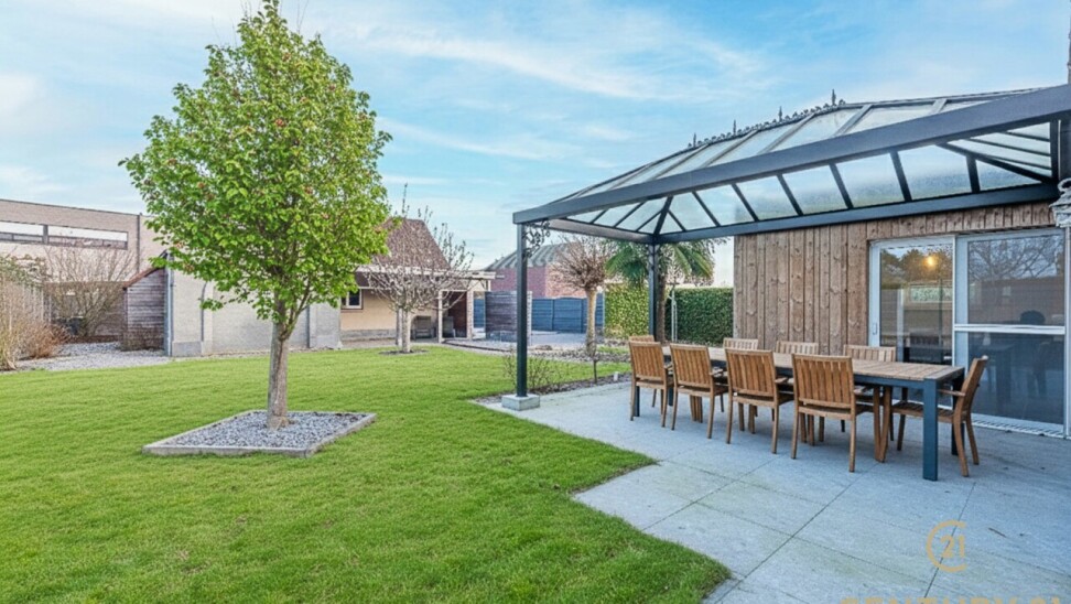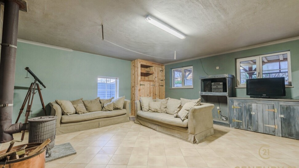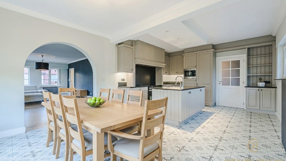 Adjacent to the living area is the large eat-in kitchen. This kitchen offers ample storage and is fully equipped with high-end appliances, including a large induction cooktop, professional oven, extractor hood, and refrigerator. From the kitchen, you can access the pleasant extension, designed as an additional sitting area with beautiful views of the garden, as well as the practical utility/laundry room, which also includes a modern walk-in shower.
