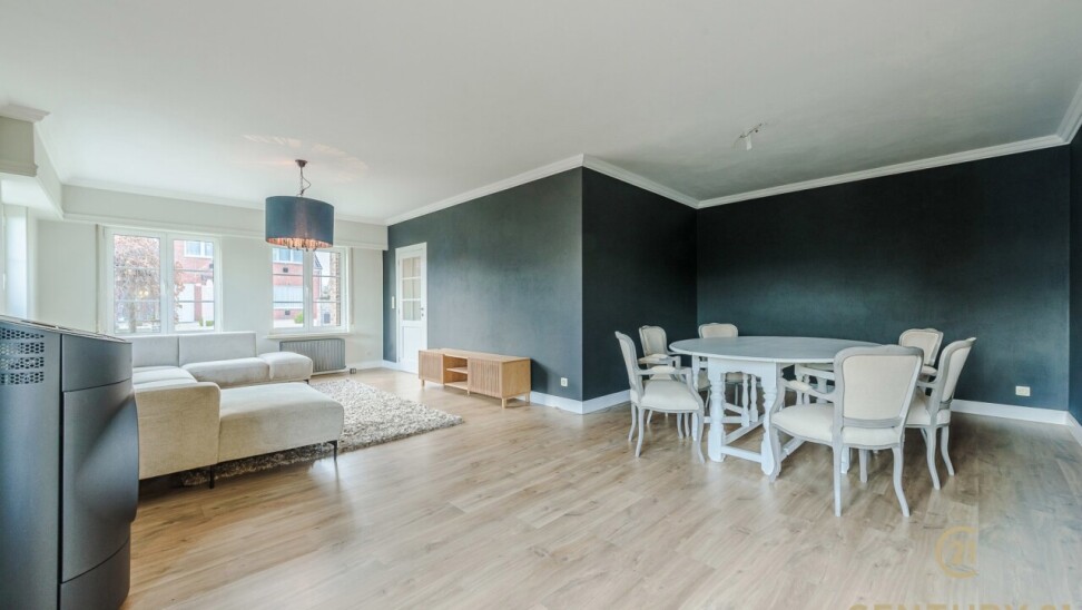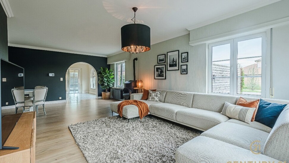 Upon entering the property, you are welcomed into a well-kept, tiled entrance hall with a guest toilet. From here, you have access to the spacious and light-filled living area, thoughtfully divided into a cozy sitting area and an inviting dining space. The room features high-quality laminate flooring and a modern pellet stove, creating a warm and stylish ambiance.