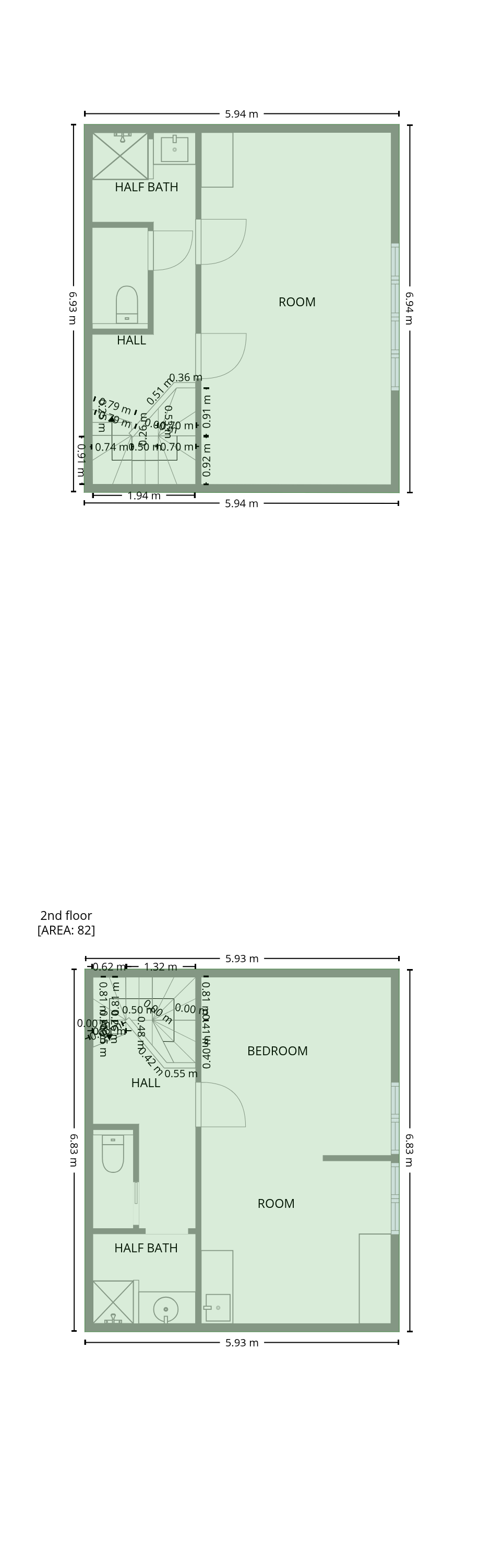 Stairs on both the left and right sides of the house lead to the upper floor. Each side has two bedrooms and a shared bathroom.