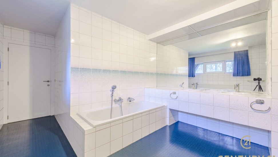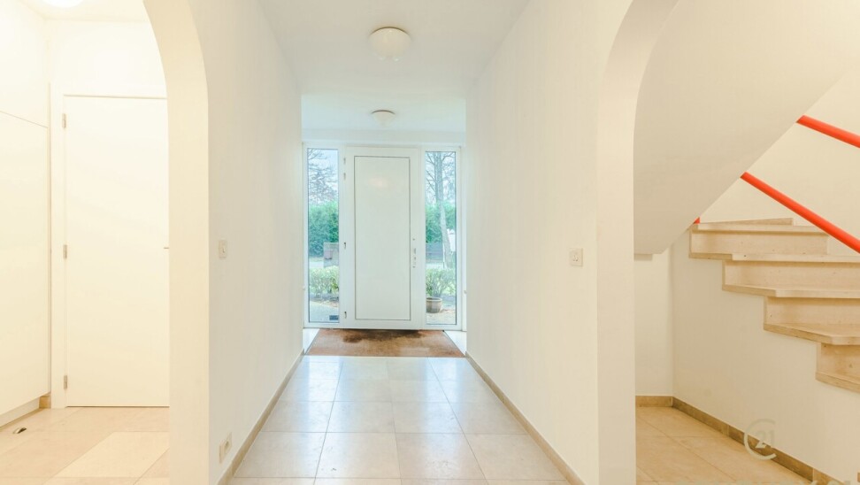 On the ground floor, the central entrance hall welcomes you with a guest toilet and cloakroom. To the left is a practical office space, to the right the double indoor garage. The living areas are on the garden side and, thanks to large windows, enjoy plenty of light and a beautiful view of the greenery. The living room with travertine flooring connects to the kitchen with Miele appliances and a cosy veranda. A side entrance provides access to the laundry room with shower and an extra storage room.