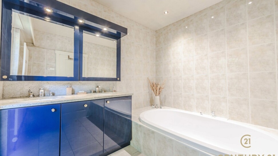The ground floor also features a master bedroom with an en-suite bathroom, complete with a bathtub and double washbasin.