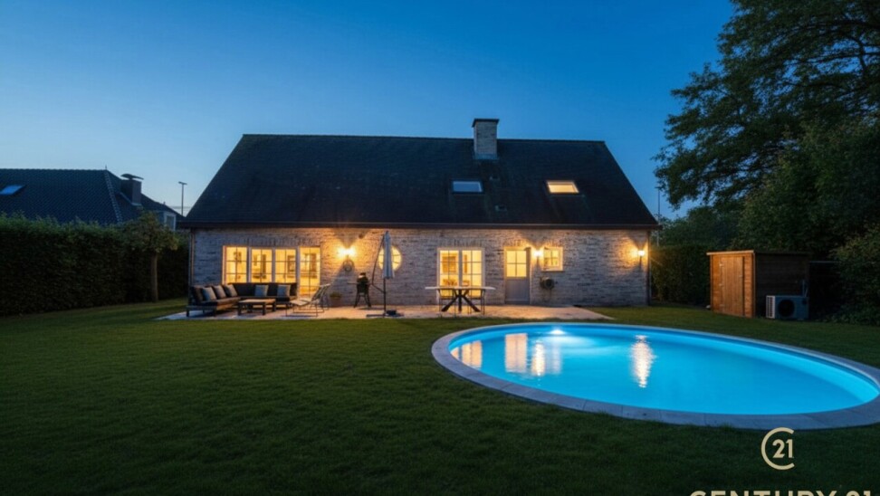 The beautifully landscaped garden is a green oasis with multiple terraces, a renovated swimming pool equipped with a heat pump, and a separate garage building. Enjoy peaceful outdoor living and privacy, complemented by the modern and energy-efficient heated pool.