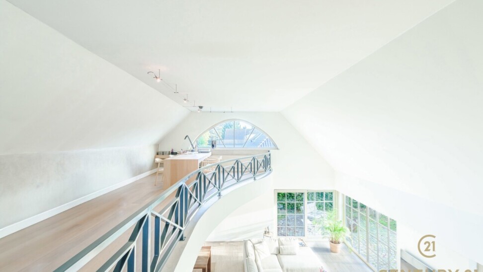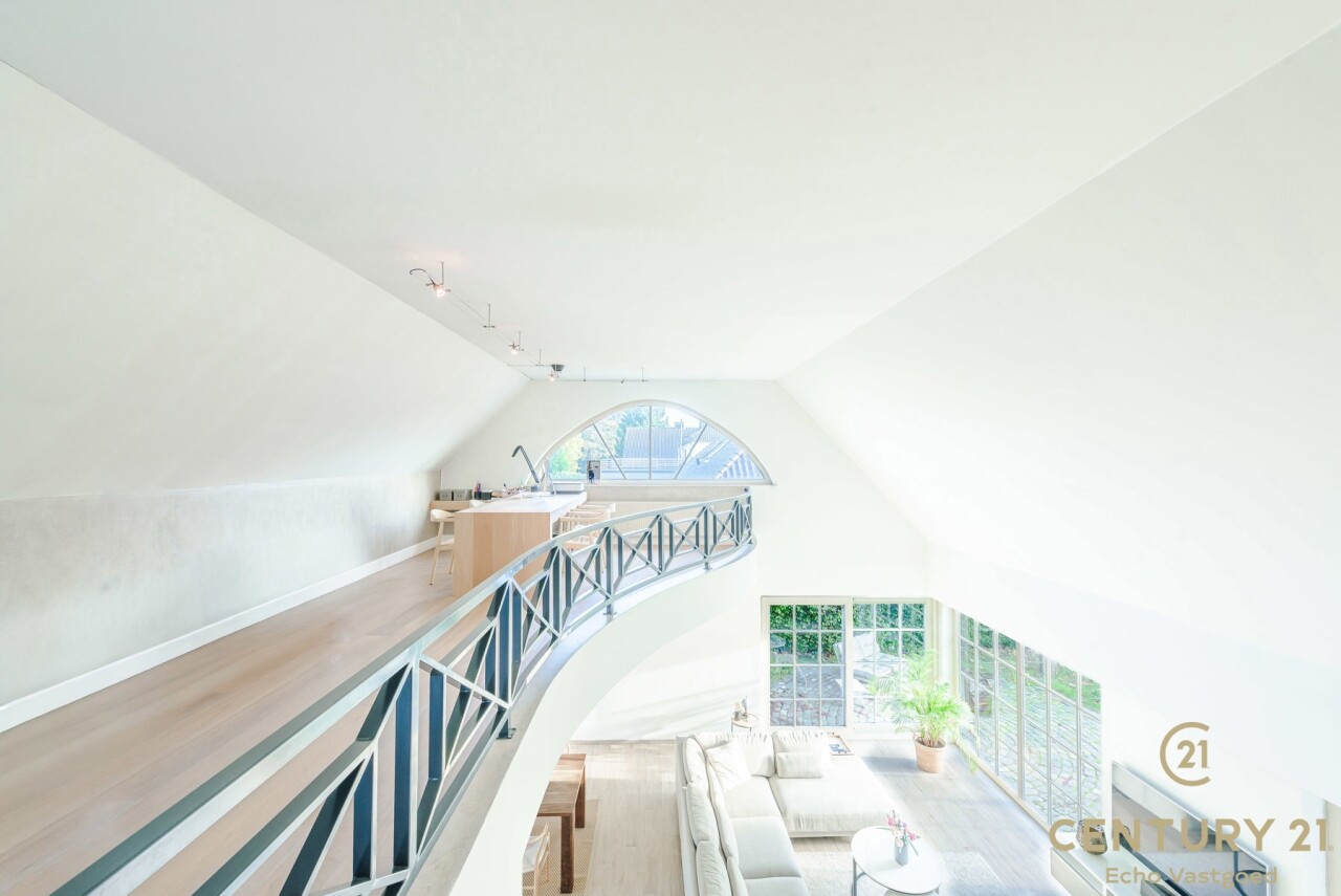 The staircase leads to the first floor, which comprises two spacious bedrooms, a second bathroom with shower, washbasin, and toilet, and an open mezzanine. The mezzanine is perfect for a home office or hobby space, maintaining a pleasant visual connection with the living area below.