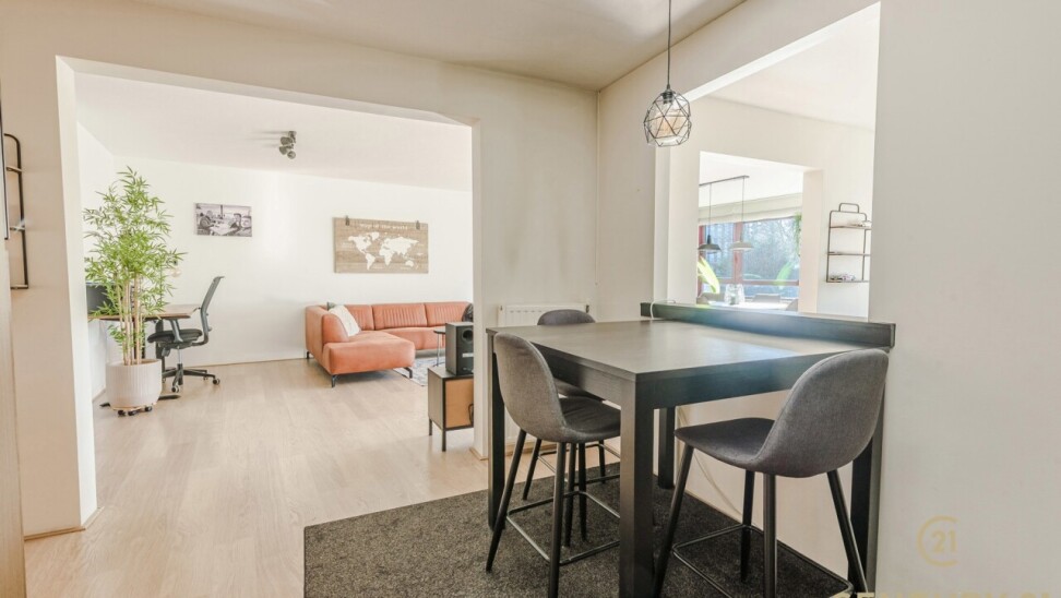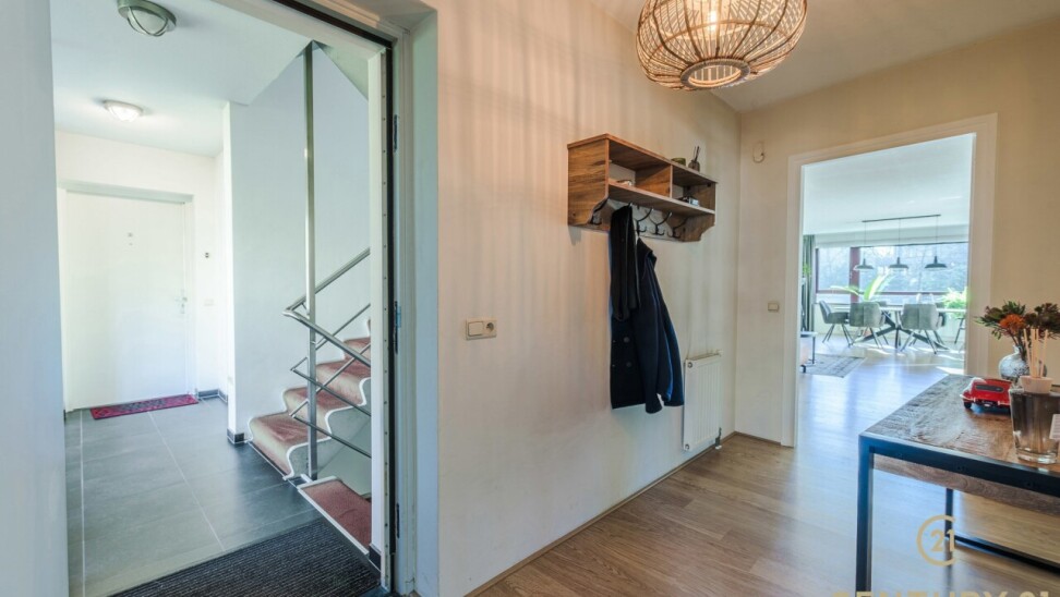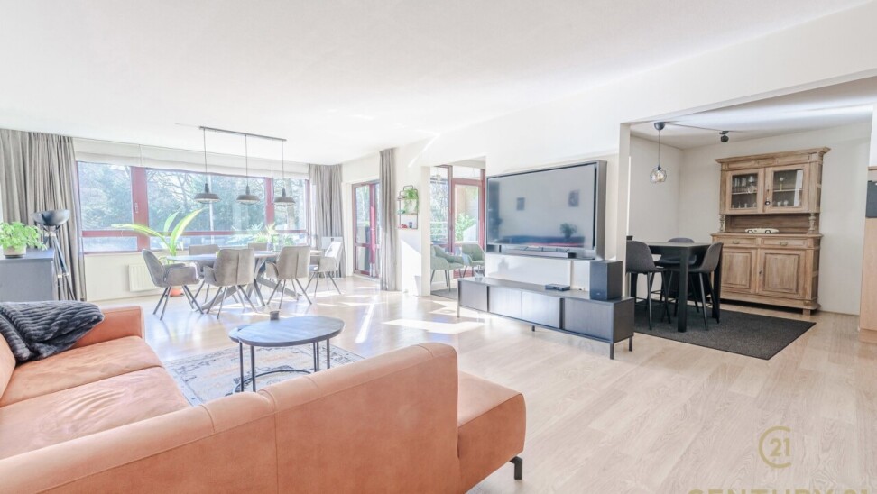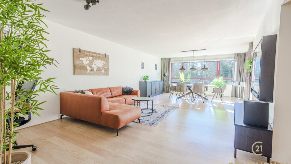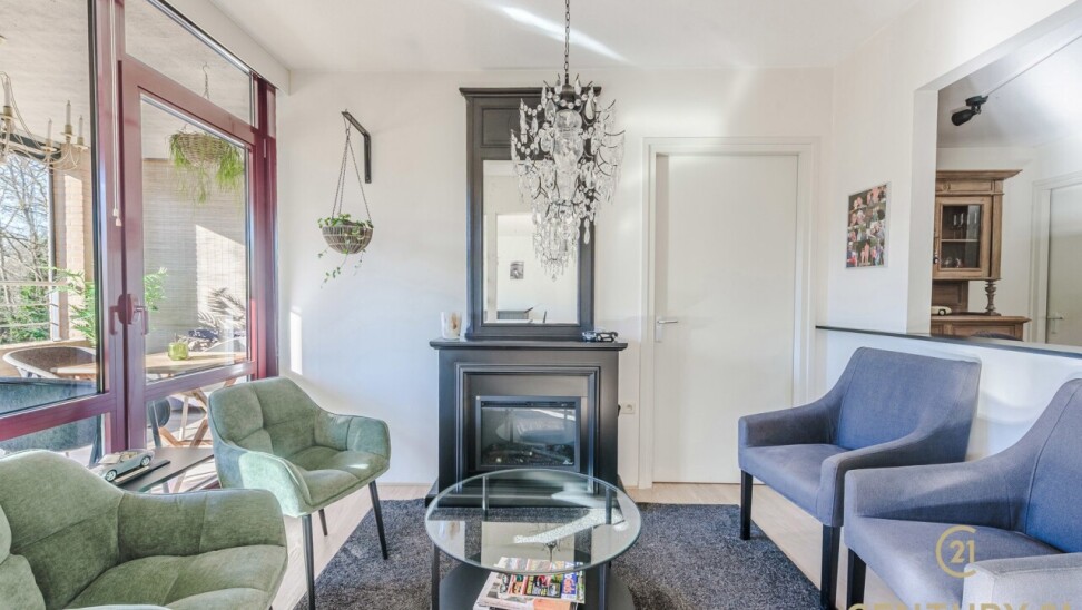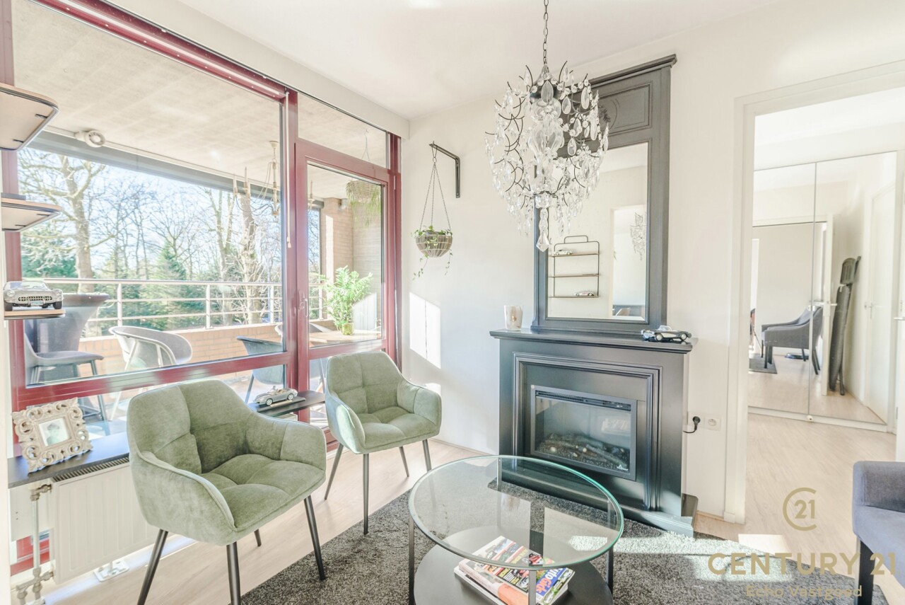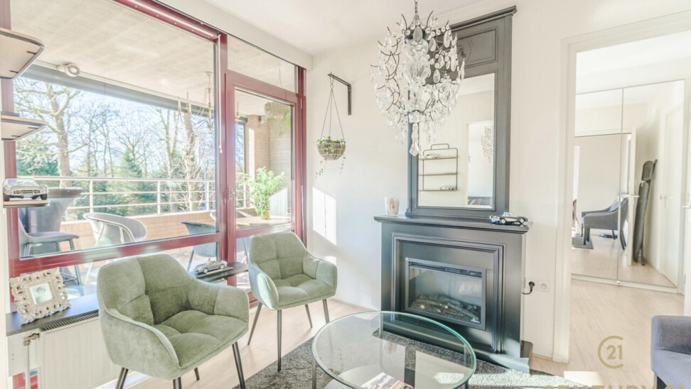 Via de gemeenschappelijk inkomhal neemt u de trap of lift naar het appartement. Daar betreedt u de inkomhal van het appartement waar het gastentoilet aan gelegen is. De ruime leefruimte biedt plaats voor een gezellige zithoek en een volwaardige eetruimte. Grote raampartijen zorgen voor een aangename natuurlijke lichtinval en versterken het open gevoel. Vanuit de living heeft u toegang tot het terras, waar u geniet van het vrije uitzicht.