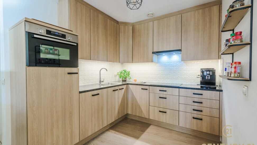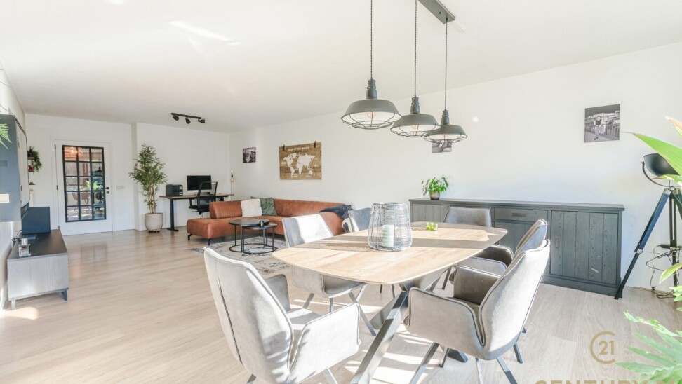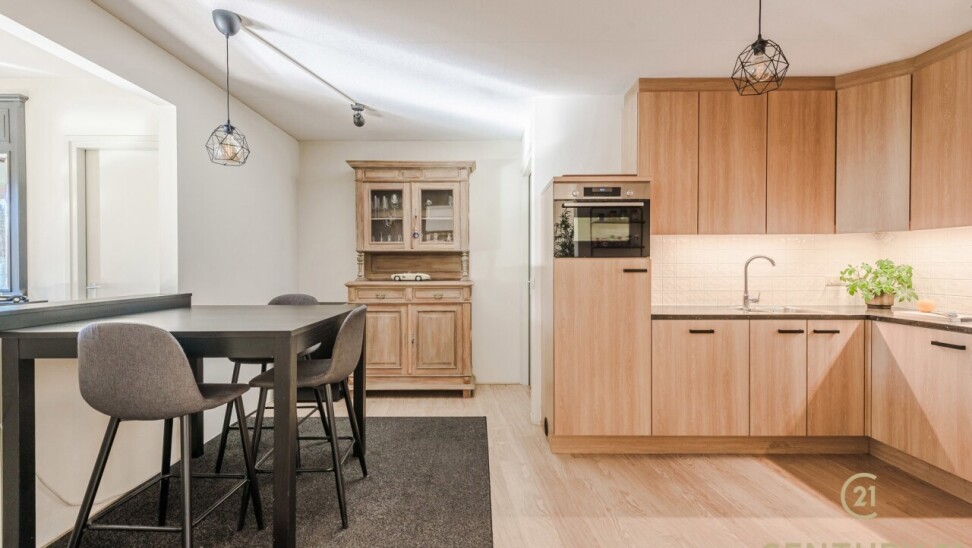 De hedendaagse keuken is afgewerkt met stijlvolle accenten en sluit naadloos aan bij de leefruimte. Achter de keuken is een praktische en ruime was- bergruimte.