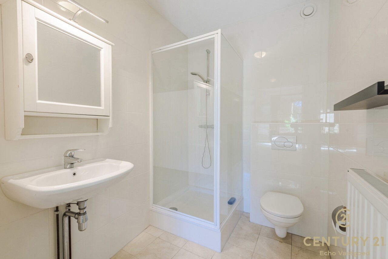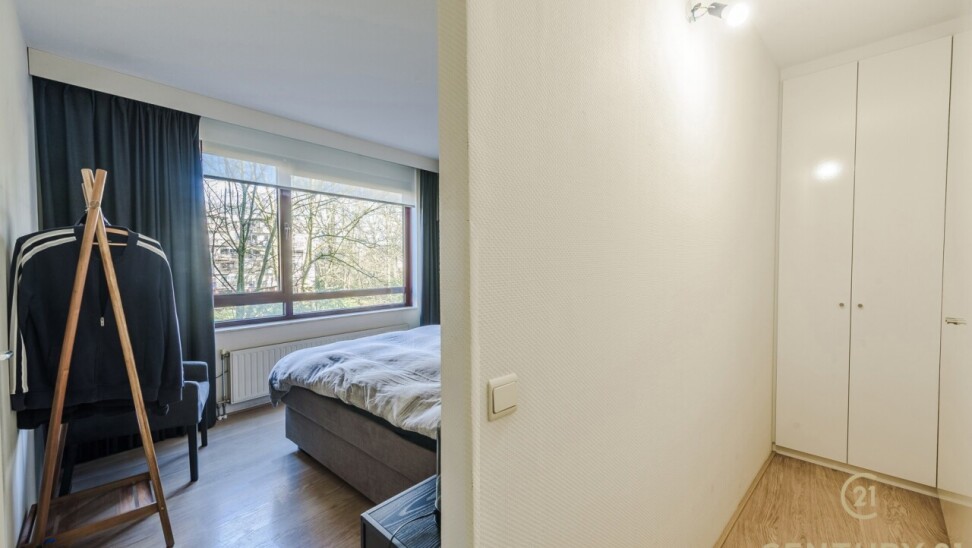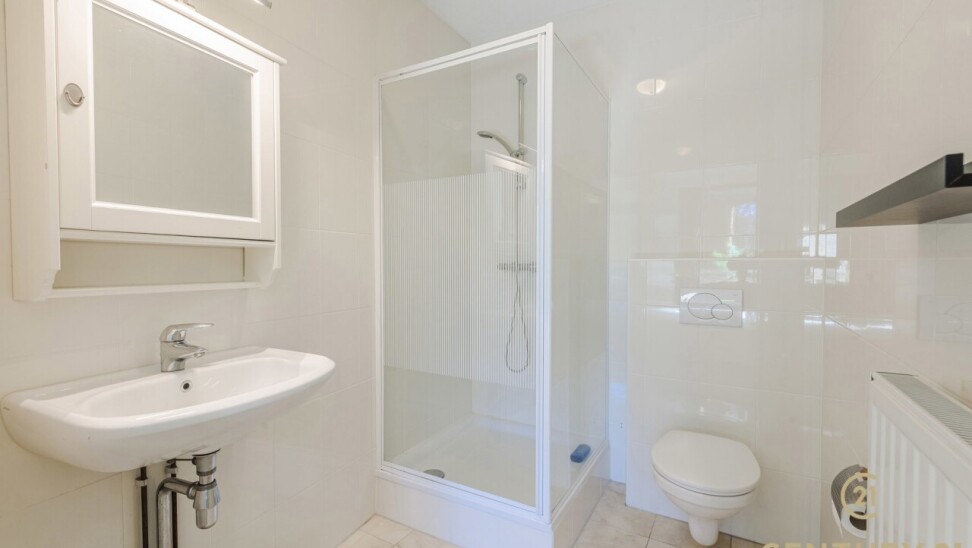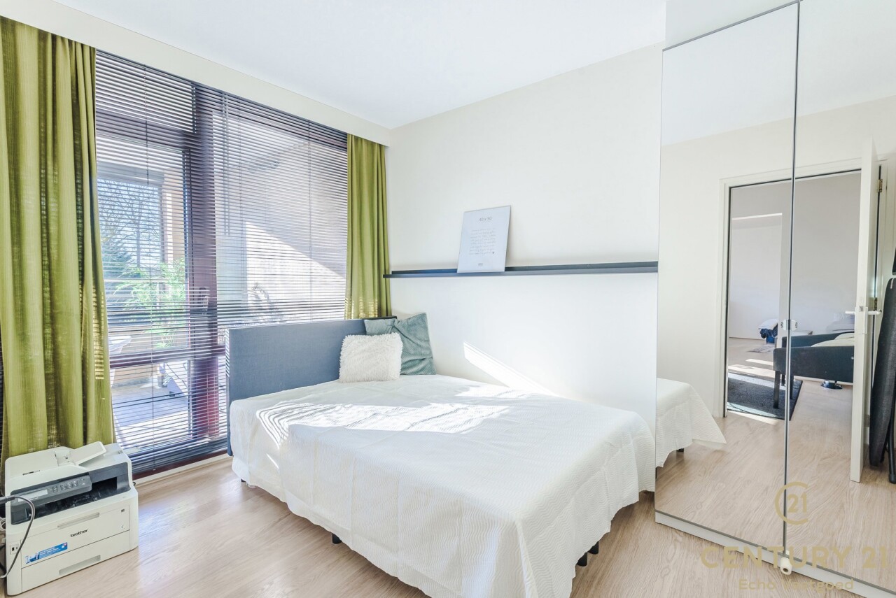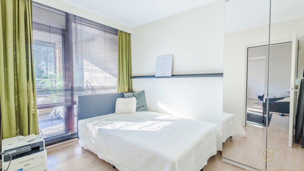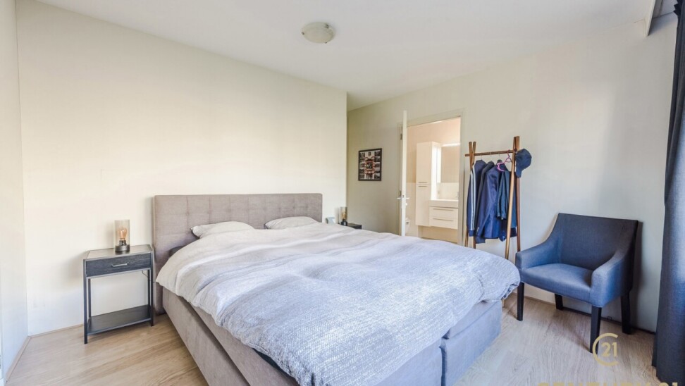 De tweede slaapkamer is ideaal als gasten-, of bureauruimte en beschikt over een eigen badkamer met douche, toilet en een wastafel. Daarnaast heeft deze kamer rechtstreeks toegang tot het terras met zonnescreen, wat zorgt voor extra lichtinval en een aangename connectie met de buitenruimte.