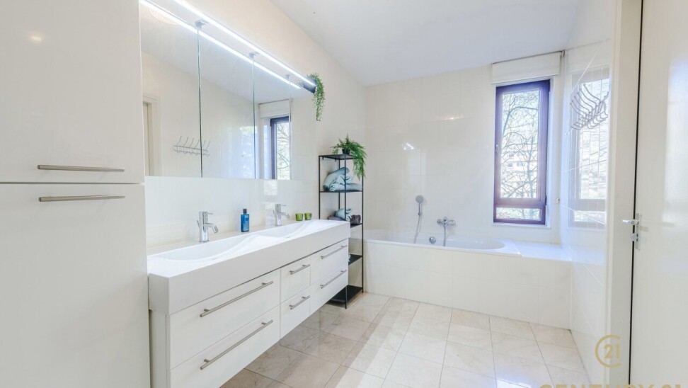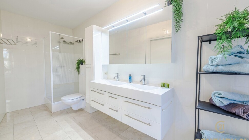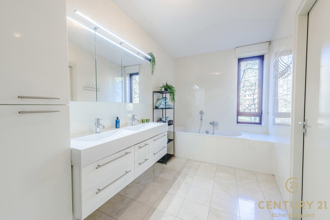 De eerste slaapkamer fungeert als volwaardige master bedroom en biedt extra comfort dankzij de aanwezigen inloopdressing en de badkamer, uitgerust met toilet, douche, ligbad én een dubbele wastafel in een fraai meubel.