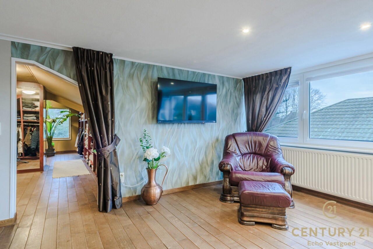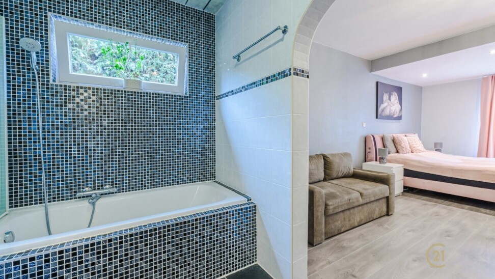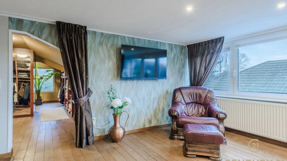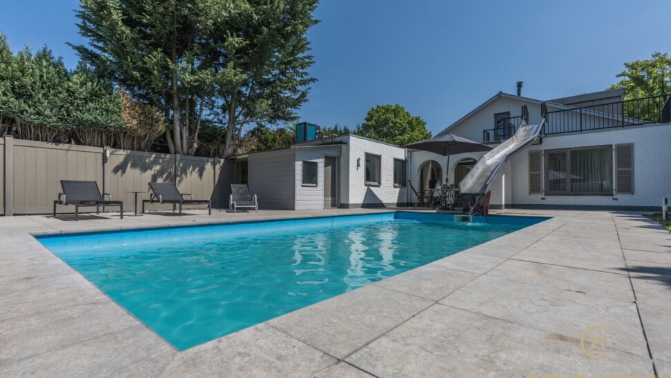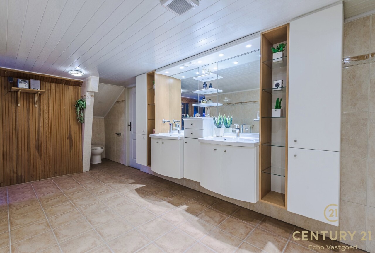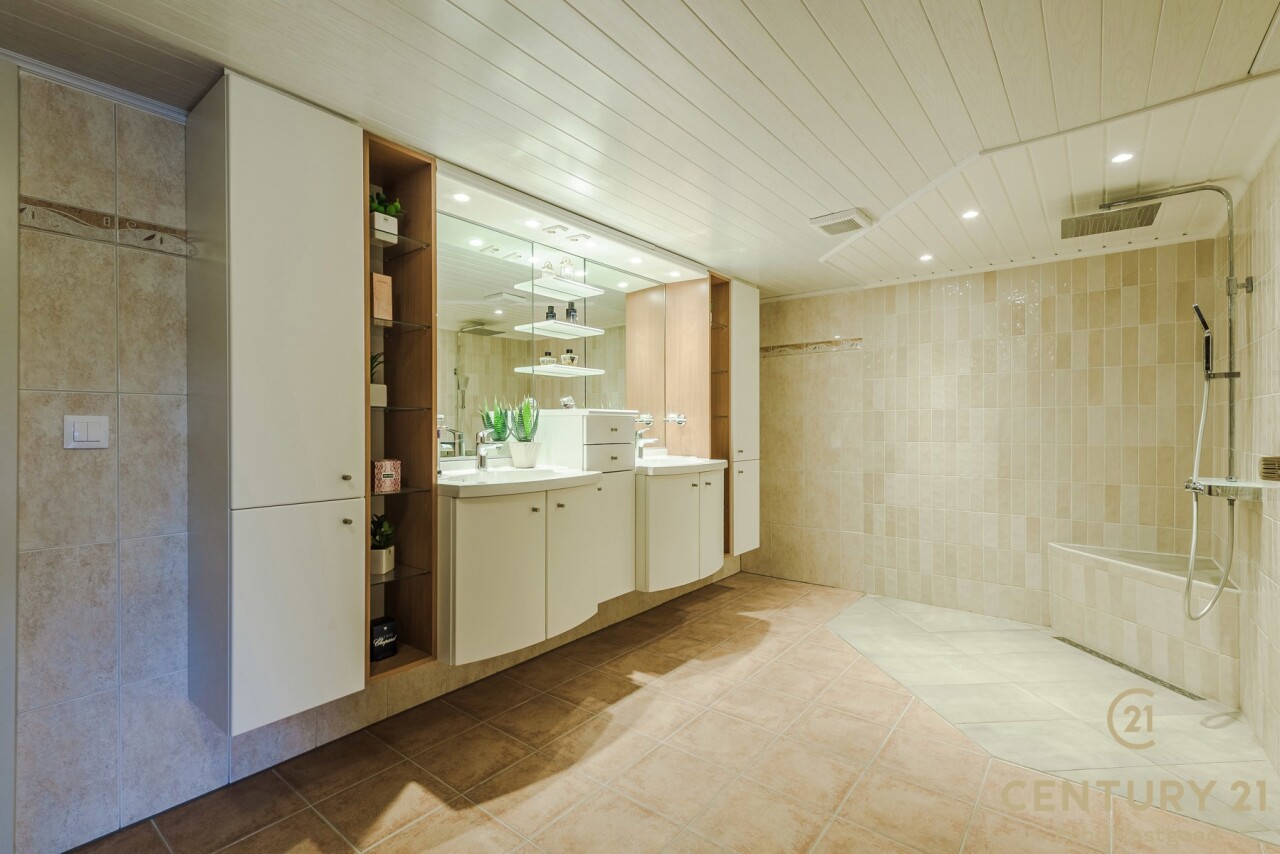 Op de bovenverdieping leidt de vaste trap naar een royale overloop met toegang tot een ruime slaapkamer, een even ruime dressing en een luxueuze badkamer uitgerust met douche, dubbele wastafel, toilet en Finse sauna. Het aangrenzende terras beschikt over een unieke waterglijbaan die uitkomt in het met warmtepomp verwarmde zwembad. Het terras en de boordstenen zijn uitgevoerd in gebrande natuursteen, wat zorgt voor een stijlvolle en hoogwaardige uitstraling.