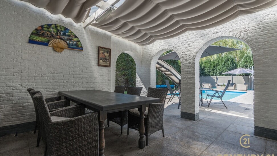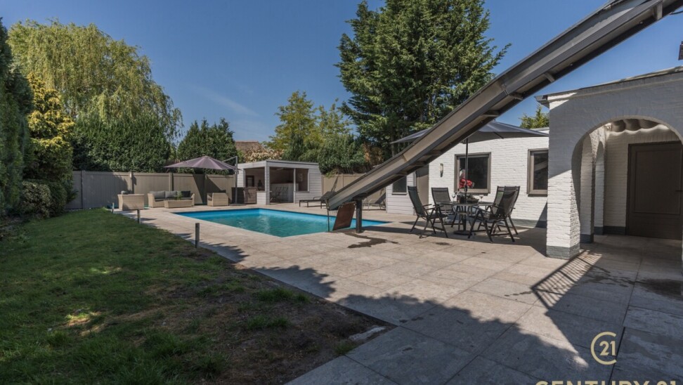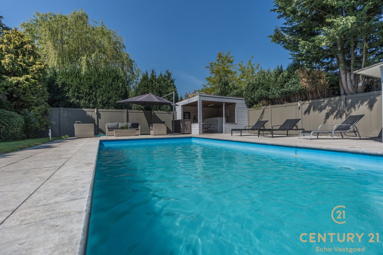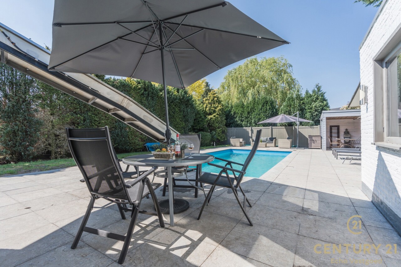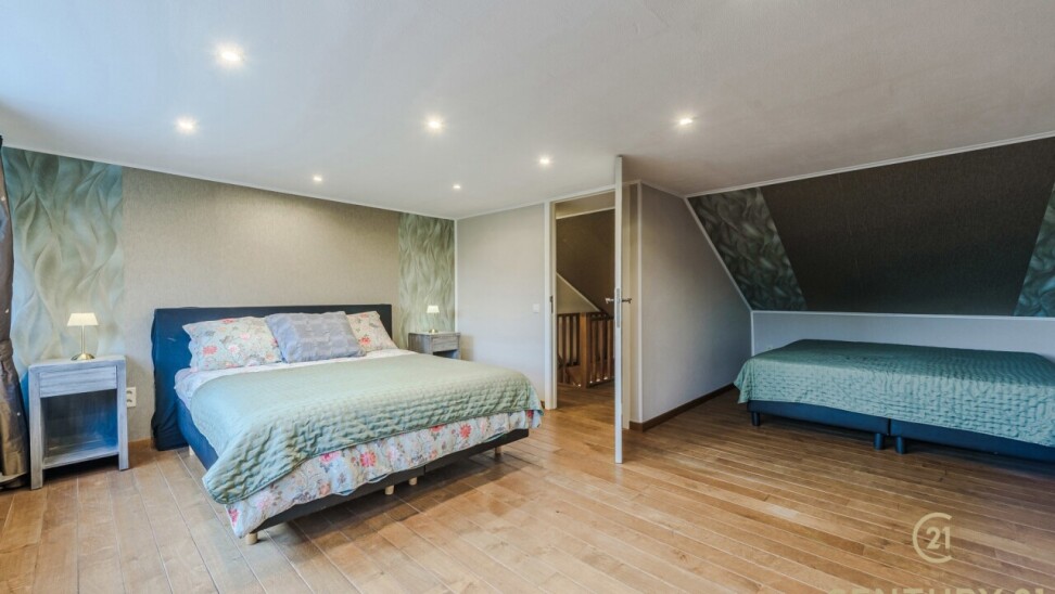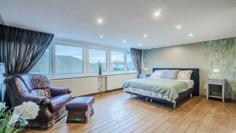 Op de bovenverdieping leidt de vaste trap naar een royale overloop met toegang tot een ruime slaapkamer, een even ruime dressing en een luxueuze badkamer uitgerust met douche, dubbele wastafel, toilet en Finse sauna. Het aangrenzende terras beschikt over een unieke waterglijbaan die uitkomt in het met warmtepomp verwarmde zwembad. Het terras en de boordstenen zijn uitgevoerd in gebrande natuursteen, wat zorgt voor een stijlvolle en hoogwaardige uitstraling.
