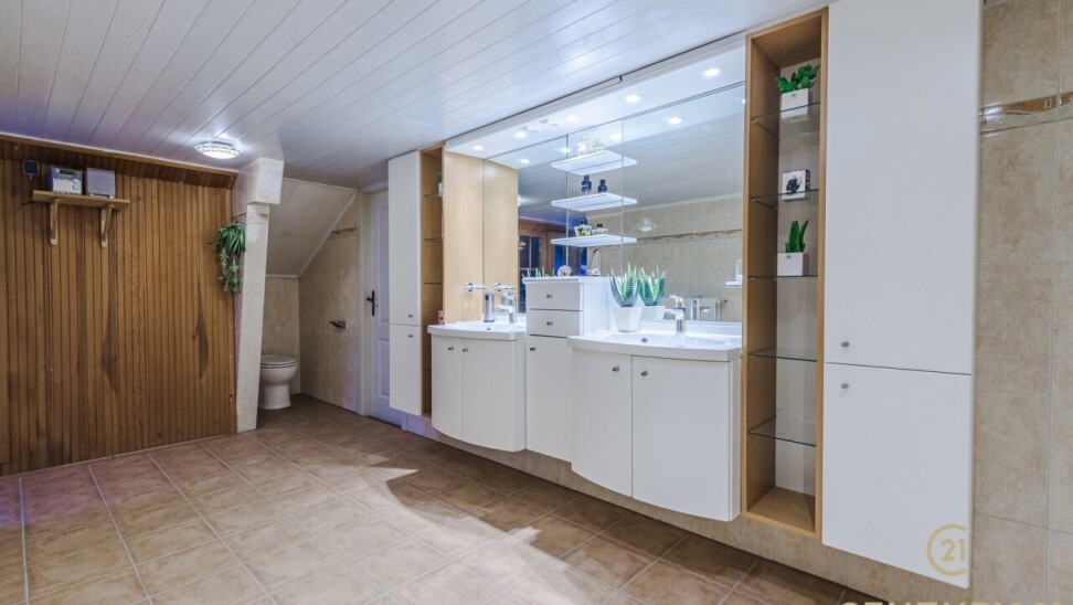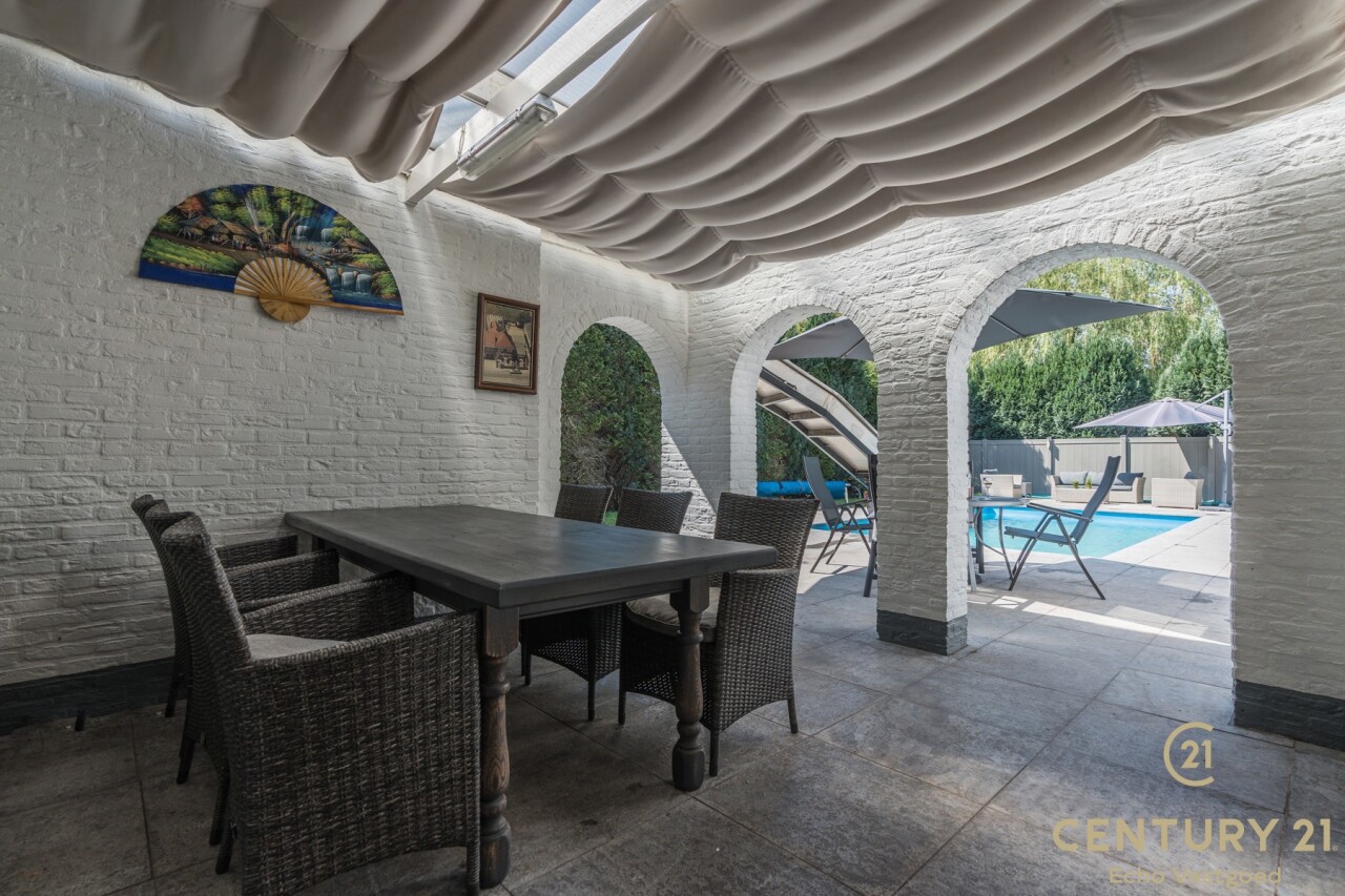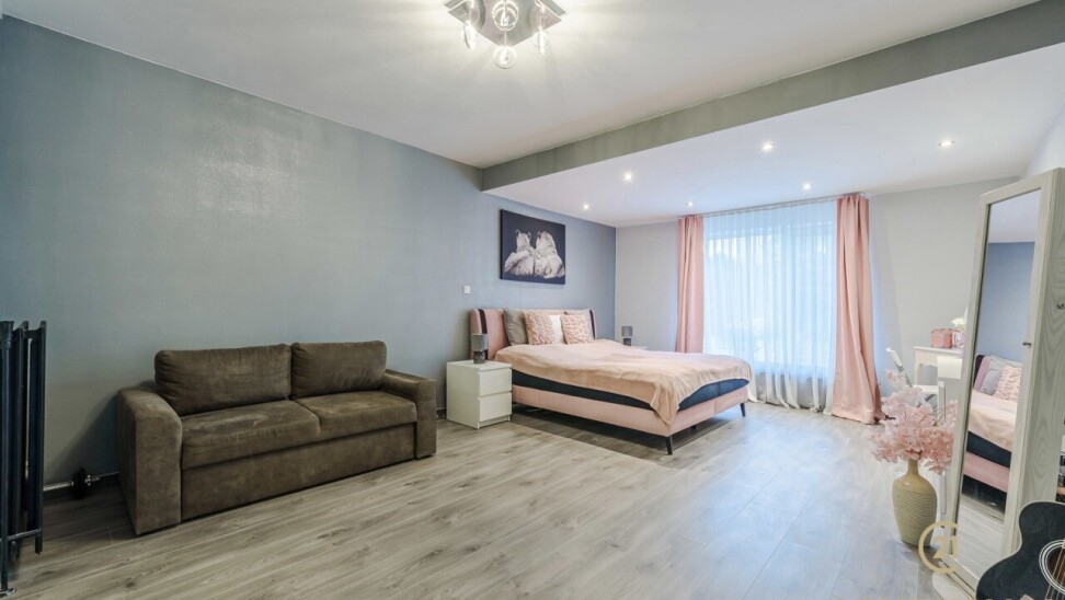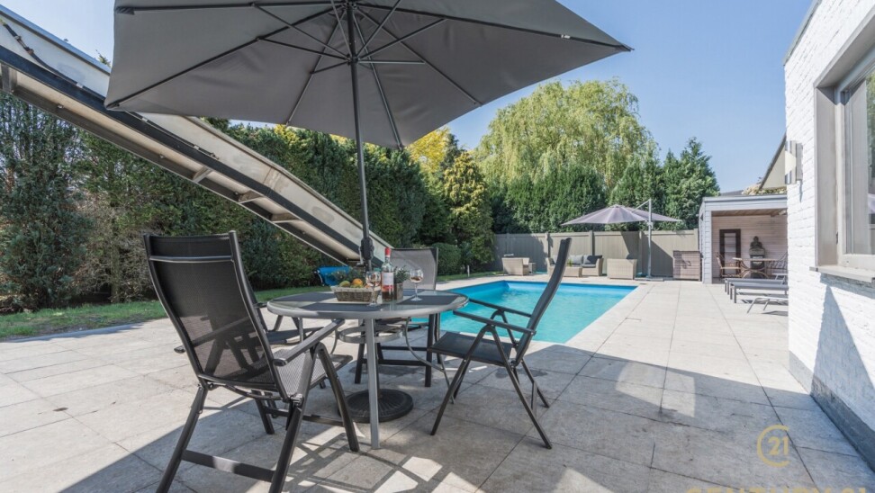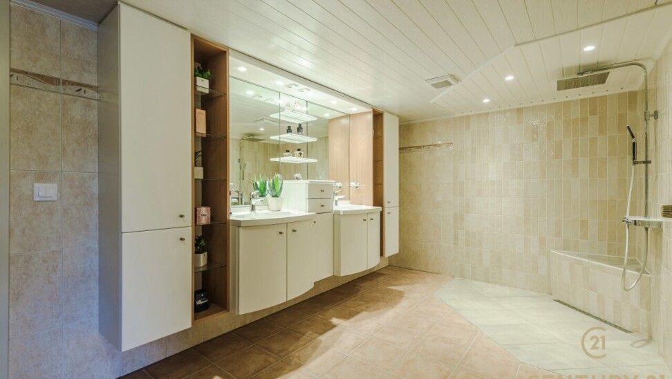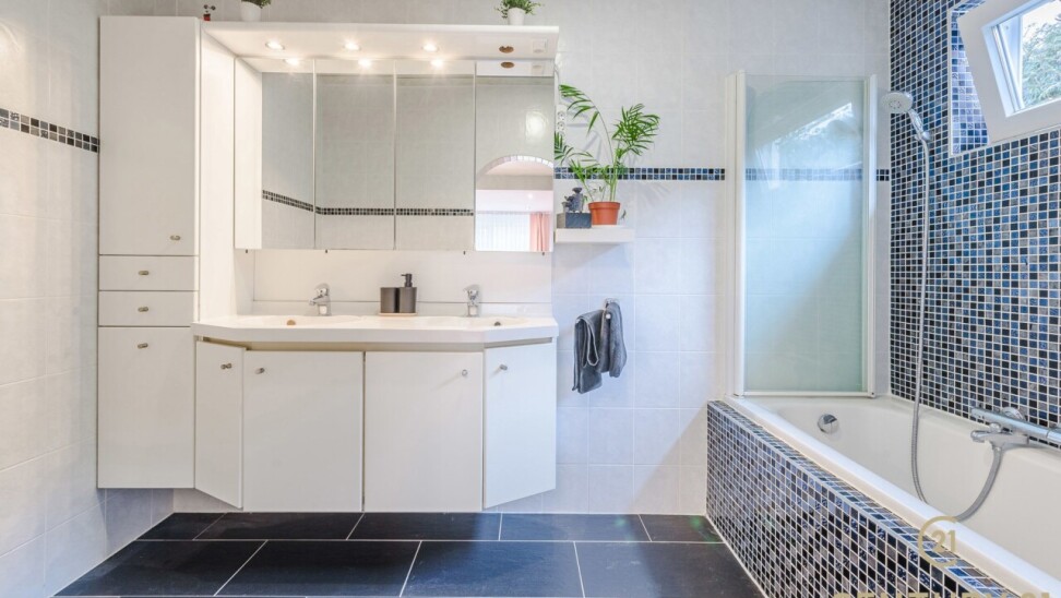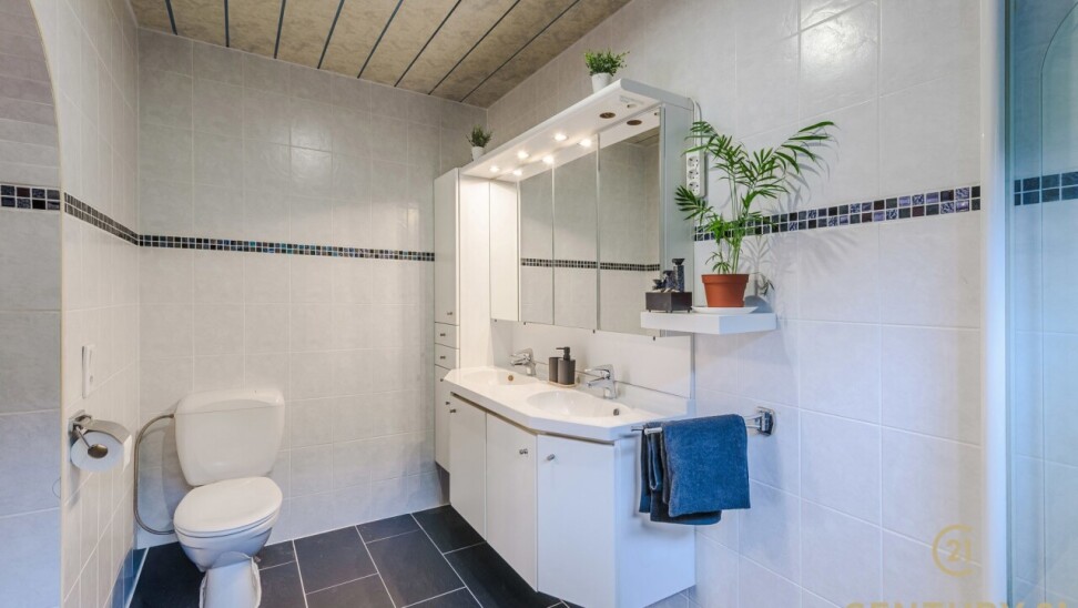 Op de bovenverdieping leidt de vaste trap naar een royale overloop met toegang tot een ruime slaapkamer, een even ruime dressing en een luxueuze badkamer uitgerust met douche, dubbele wastafel, toilet en Finse sauna. Het aangrenzende terras beschikt over een unieke waterglijbaan die uitkomt in het met warmtepomp verwarmde zwembad. Het terras en de boordstenen zijn uitgevoerd in gebrande natuursteen, wat zorgt voor een stijlvolle en hoogwaardige uitstraling.