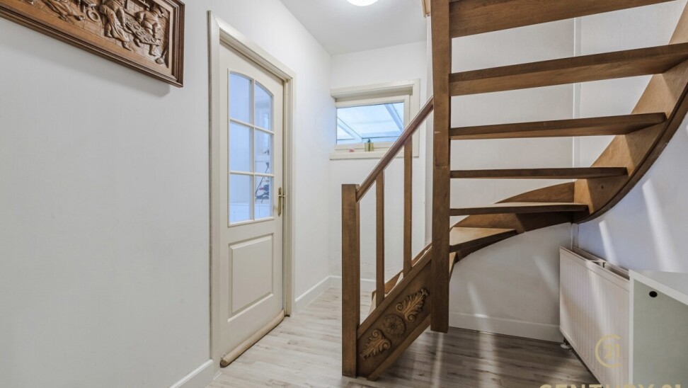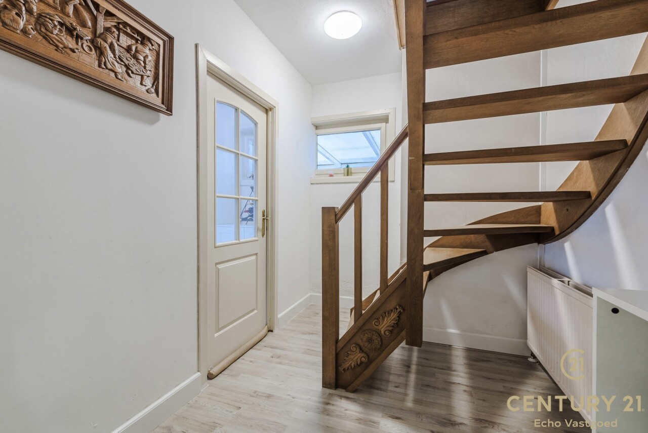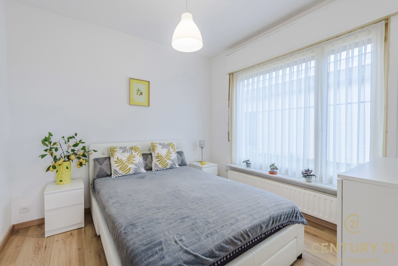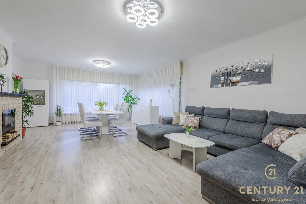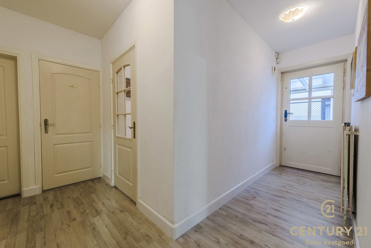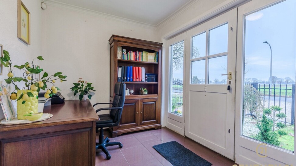 Bij binnenkomst treft u een inkomhal met aansluitend een bureau- of slaapkamer, perfect voor thuiswerk of gelijkvloers wonen. De woonkamer vormt het hart van de woning en biedt toegang tot de geïnstalleerde keuken en de gang. Via de gang bereikt u de zij-ingang, een gastentoilet en een extra logeerkamer.