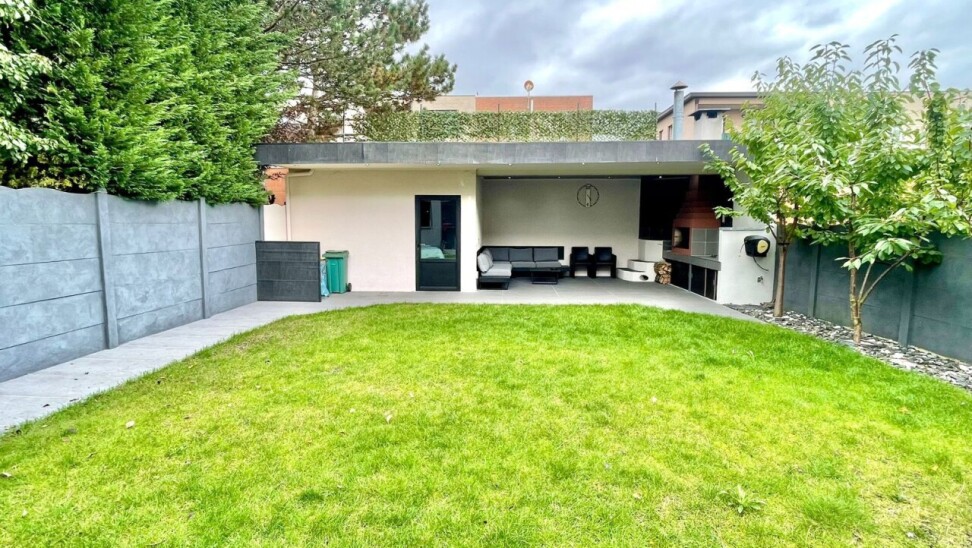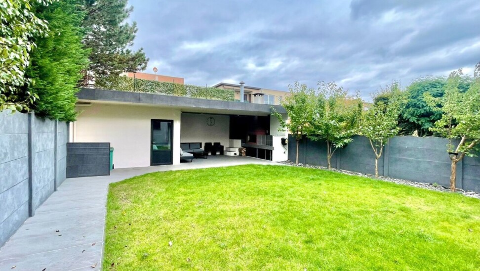 Op het gelijkvloers bevindt zich tevens een ruim toilet met aansluitingen voor een was- en droogmachine, en de mogelijkheid om een extra douche te installeren. De garage, voorzien van een automatische rolpoort, biedt niet alleen parkeergelegenheid maar geeft ook directe toegang tot de tuin.