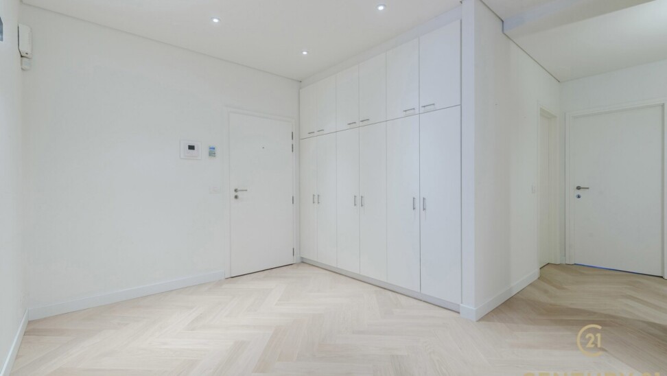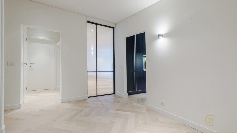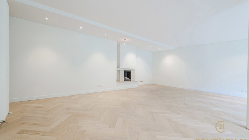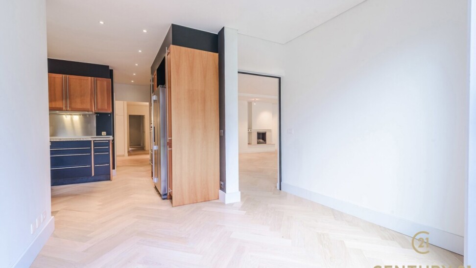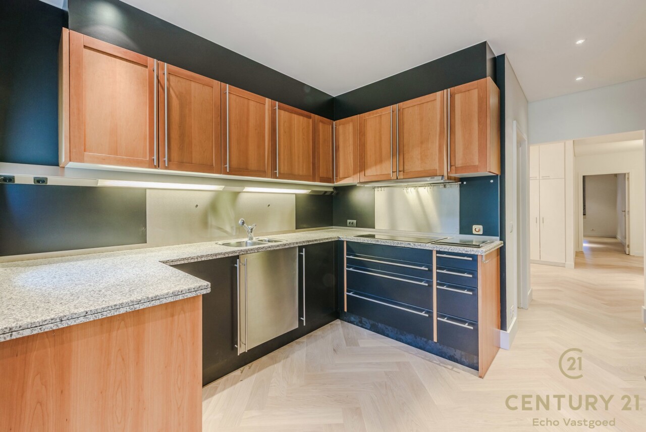 De inkomhal met vestiaire en gastentoilet vormt een elegante entree. De ruime, open leefruimte sluit naadloos aan op de eetkamer en de volledig ingerichte, moderne keuken – een uitnodigende plek voor zowel intieme diners als het ontvangen van gasten. In 2026 werd het appartement bovendien stijlvol geüpdatet met massief eiken visgraatparket, wat zorgt voor een warme en tijdloze uitstraling, en werden er elegante staal-glasdeuren geplaatst tussen de woonkamer en de keuken, die licht en ruimte op een verfijnde manier met elkaar verbinden.
