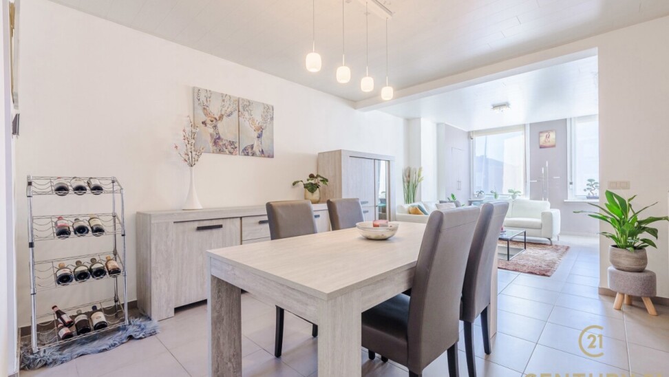De open keuken vloeit harmonieus over in de gezellige leefruimte, met voldoende plaats voor een ruime eethoek en een comfortabele zithoek. De voorgevelramen zijn uitgerust met elektrisch bedienbare rolluiken, wat bijdraagt aan extra comfort en privacy.