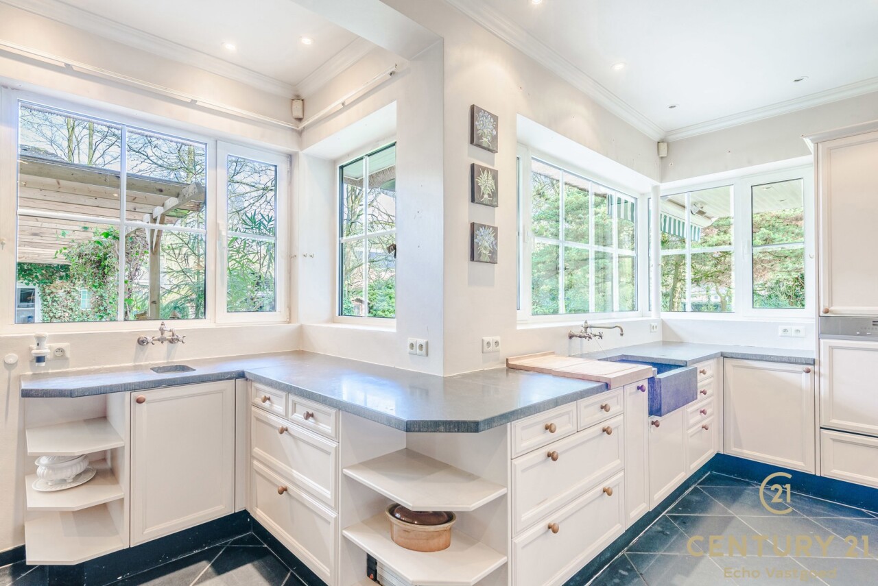 Via de ruime inkomhal met gastentoilet en aparte bureauruimte betreedt u de sfeervolle leefruimte. De gezellige open haard, de brede raampartijen en de naadloze overgang naar de eetkamer zorgen voor een warme, huiselijke sfeer met overal zicht op de prachtige tuin. De volledig uitgeruste keuken is aangenaam ruim en beschikt over een aansluitende berging.