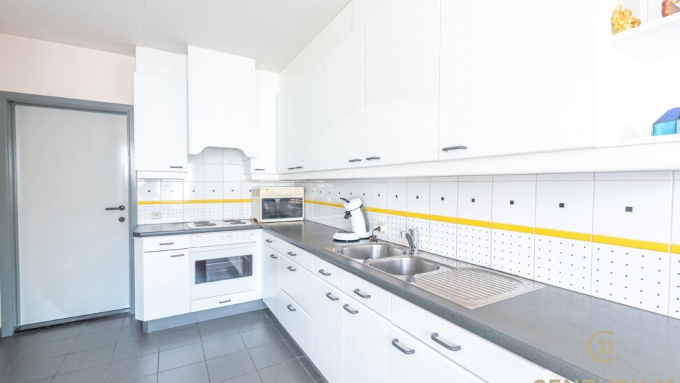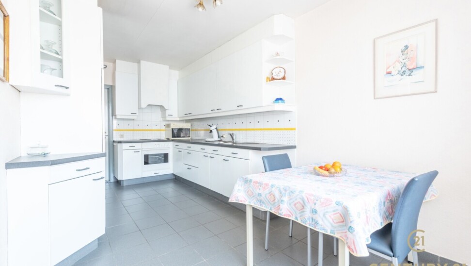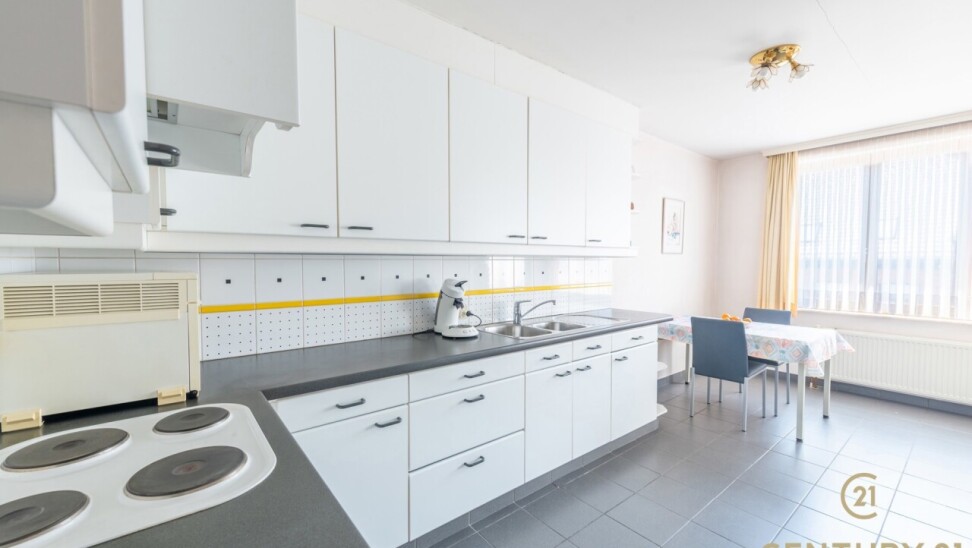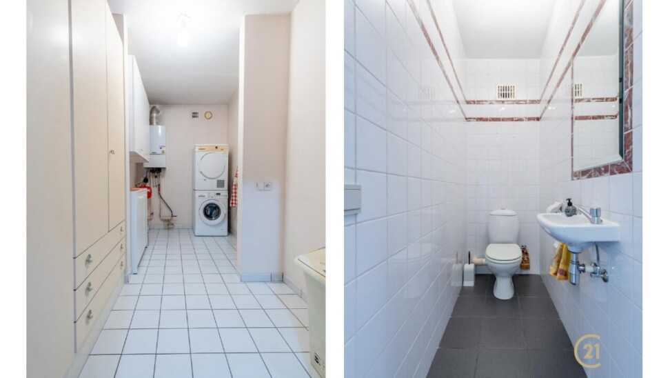 De praktisch ingedeelde keuken biedt alle nodige toestellen, overvloed aan kastenruimte en een gezellig ontbijthoekje. Aansluitend is er een handige berging met aansluiting voor was- en droogmachine, ook bereikbaar via de hal.
