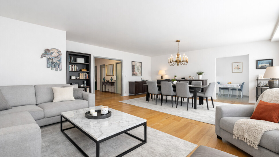 Via de verzorgde inkomhal met ingemaakte kasten en een apart gastentoilet met handenwasser, betreedt u de woning. Dubbele openslaande deuren geven toegang tot de indrukwekkende lichtrijke leefruimte, afgewerkt met een prachtige massief eiken parketvloer, die ook doorloopt in de inkomhal – een stijlvolle en warme uitstraling gegarandeerd.